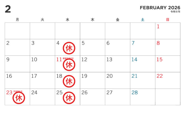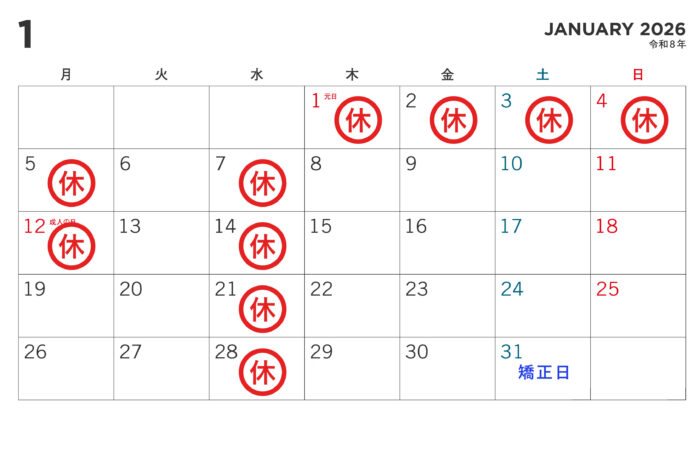 1月、2月の休診日のお知らせ 2026年01月13日 当院では下記日程(休の日)を休診とさせていただきます。あらかじめご了承頂きます様、お願いいたします。 ※2月の矯正は多田先生のご都合がつかず、1/31(土) へ変更させていただきます。